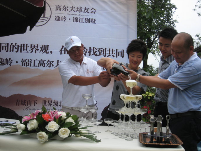 当天的活动中,更力邀品牌“竹叶青”在现场进行“论道”茶艺表演。启动仪式中,在公众的呼声中,诞生了由逸岭锦江业主担任的球会秘书长和副秘书长。逸岭锦江营销总监杨总及球友会首席教练艾教练一起,开启香槟,宣告球友会盛大成立。