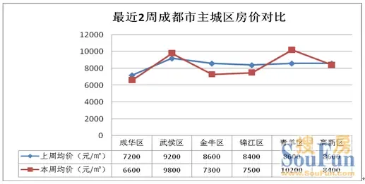 搜房网数据监控中心监测显示:最近一周成都市主城区商品房成交均价为8300元;较前一周下降0.15%, 从上周实际开盘情况来看,上周成都市新开11盘,其中主城区(含高新西区)开6盘,主城区新盘均价为7733元/平米,新开盘价格的下降在一定程度上影响到成都整体均价。