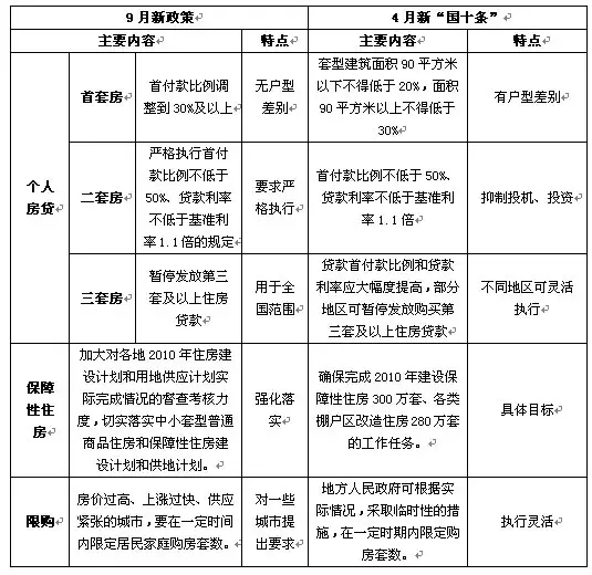 4月“新政”首套建筑面积90平方米以下首付款不得低于20%,面积90平方米以上不得低于30%,9月政策要求不分户型首付款比例调整到30%及以上;再者,暂停发放第三套及以上住房贷款方面;4月“新政”内容部分地区可根据实际情况选择是否执行,9月政策要求全国范围都要执行;另外,对不认真执行差别化信贷政策的商业银行,一经查实要严肃处理。